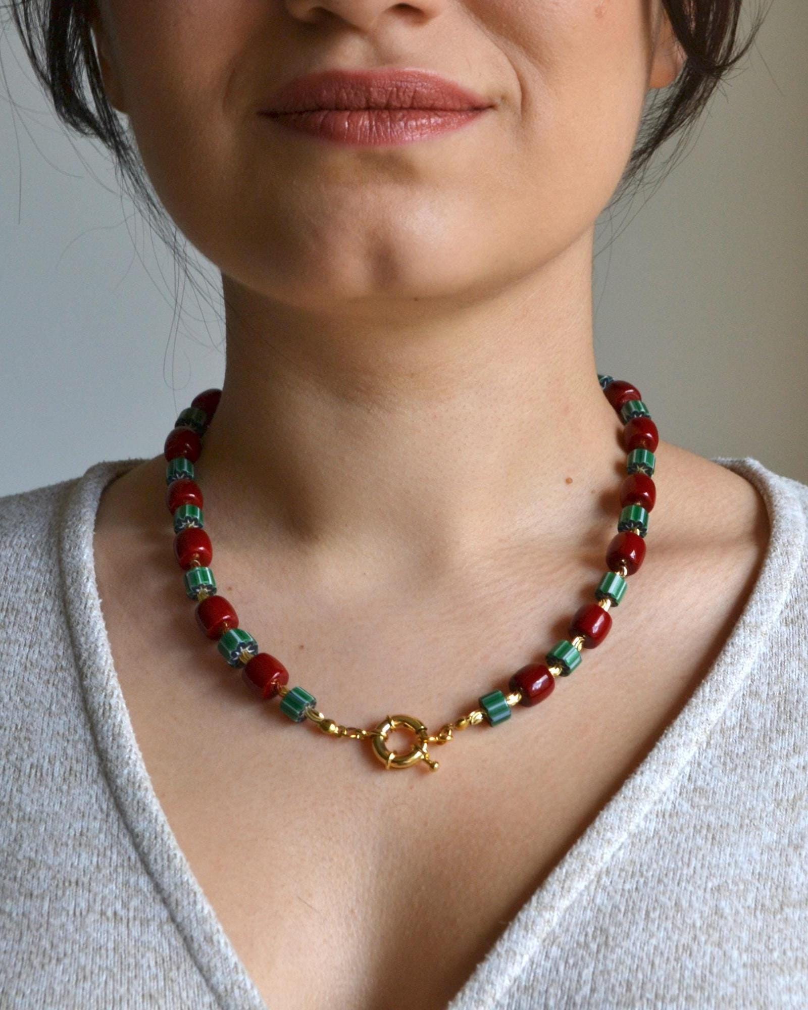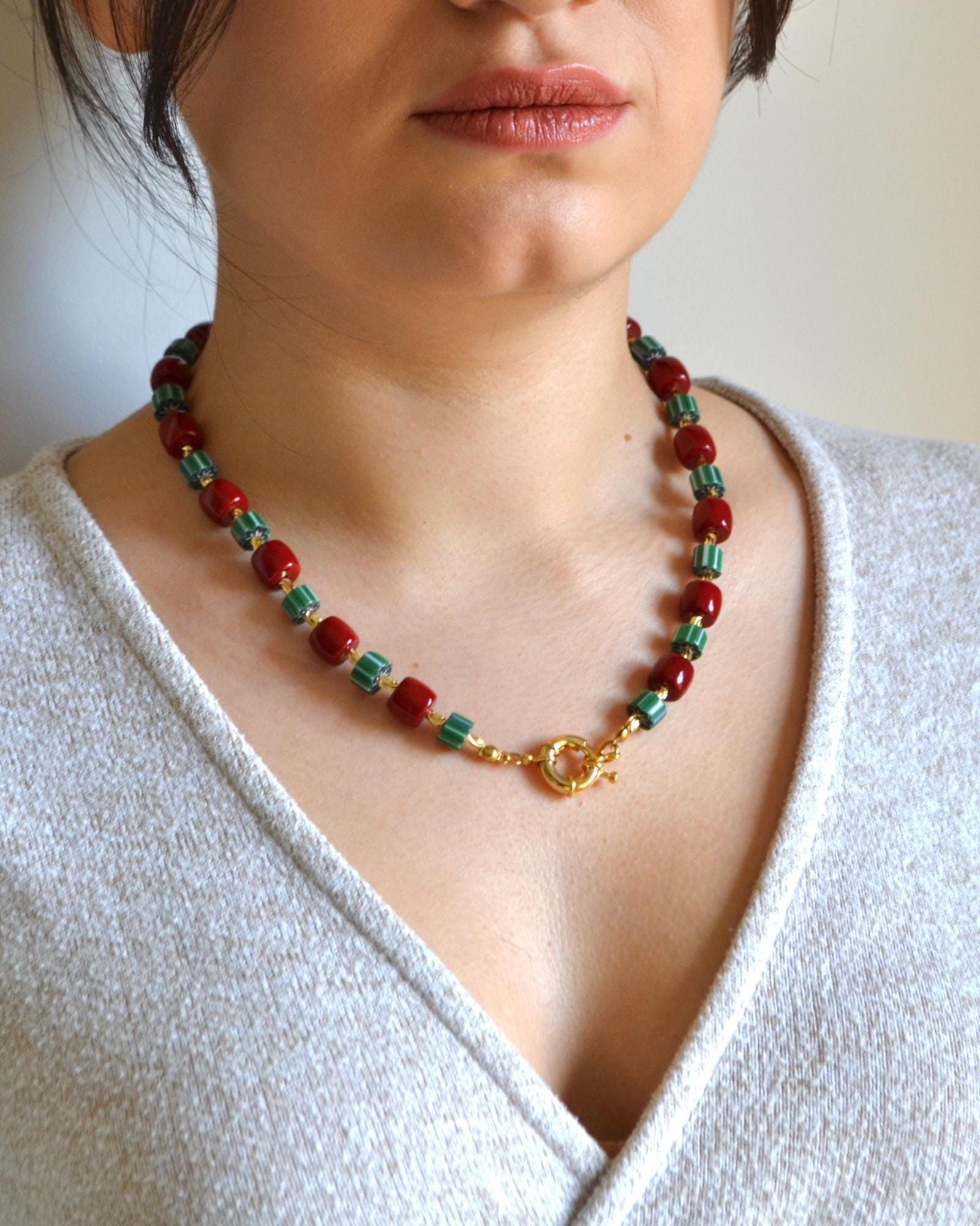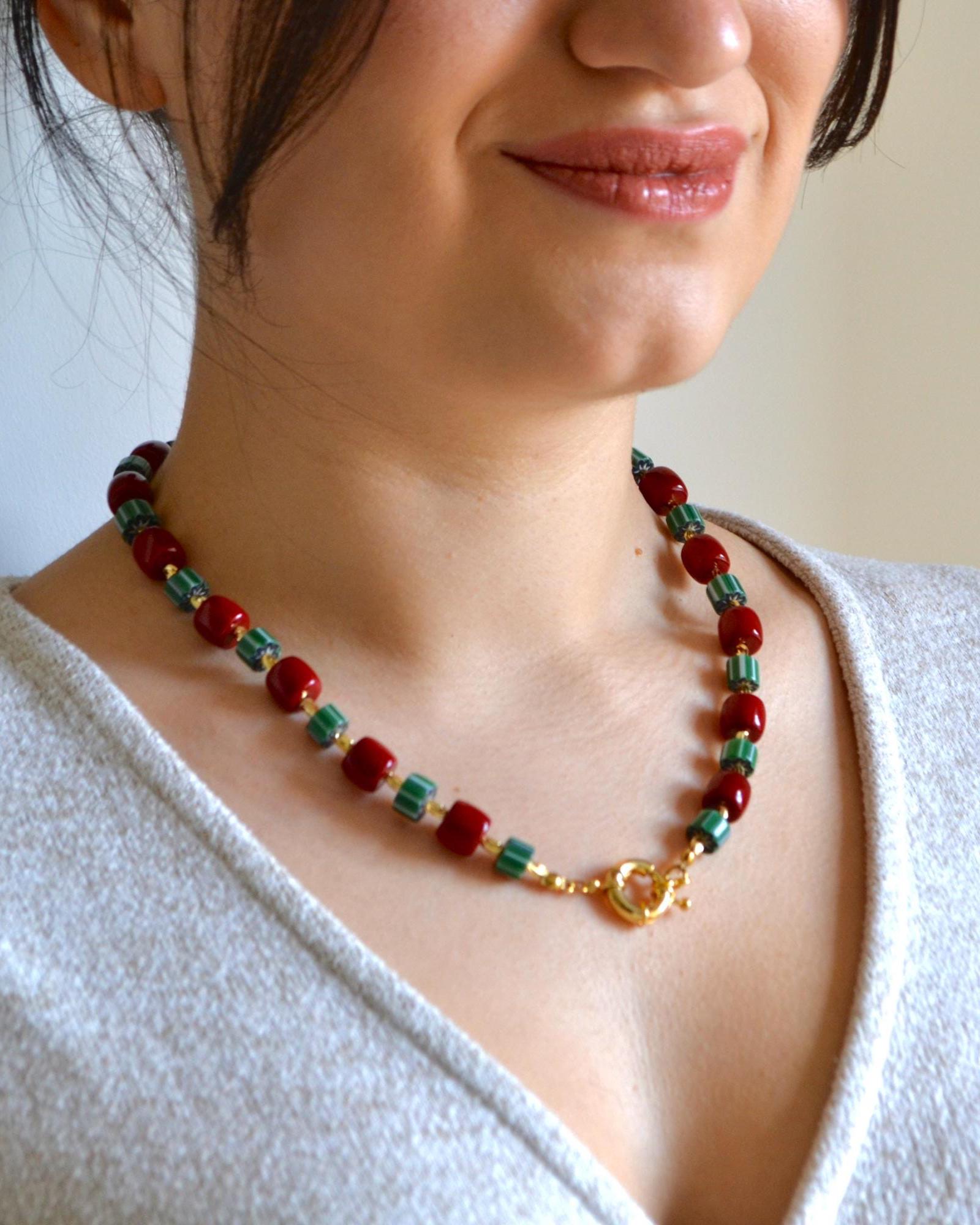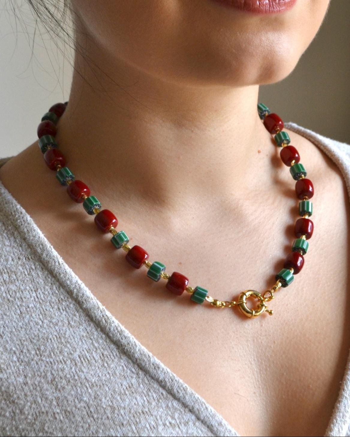 This necklace pairs rich red beads with deep green striped stones and warm gold accents for a striking yet balanced look. The contrast of colors creates a modern statement piece that instantly elevates even the simplest outfit.