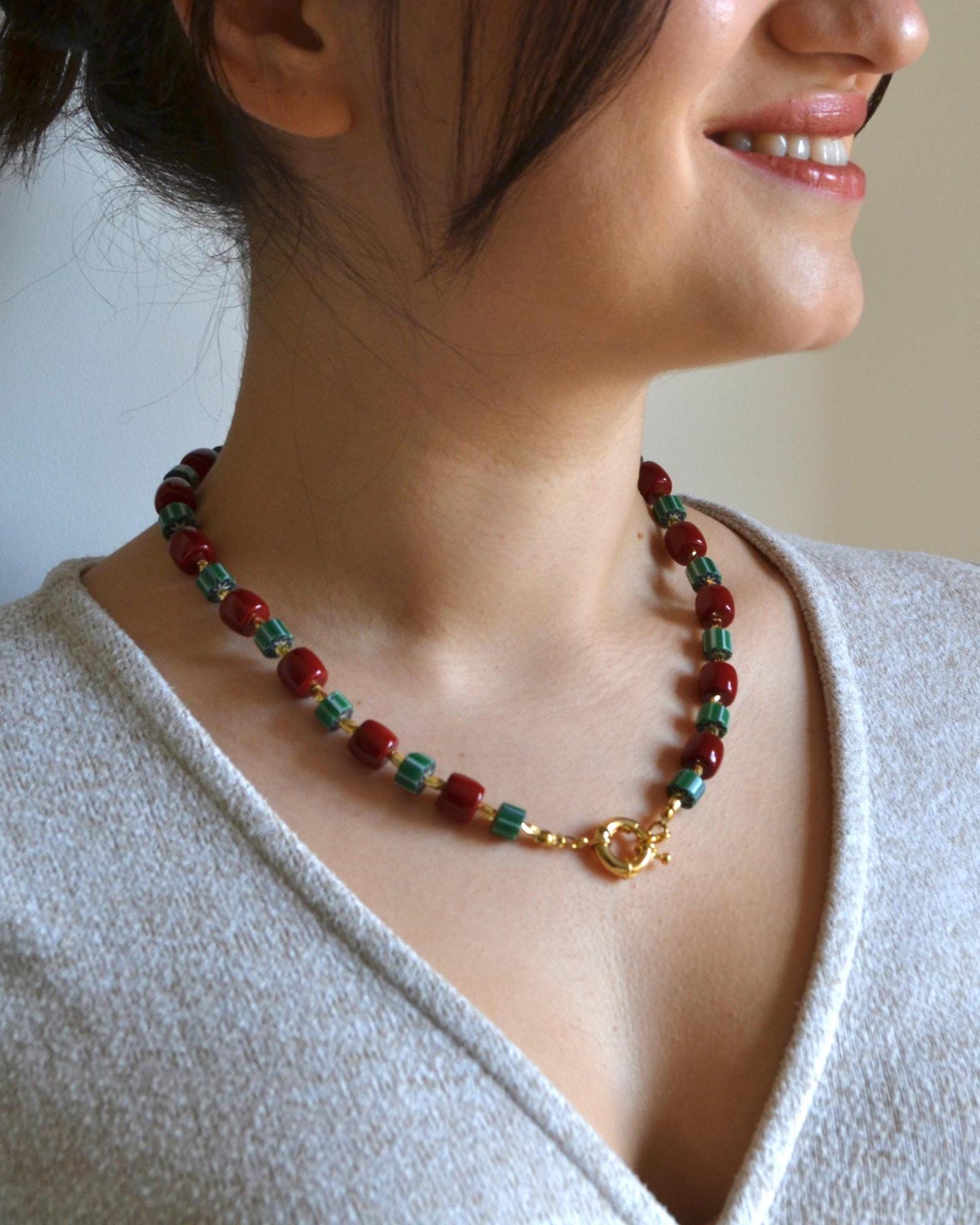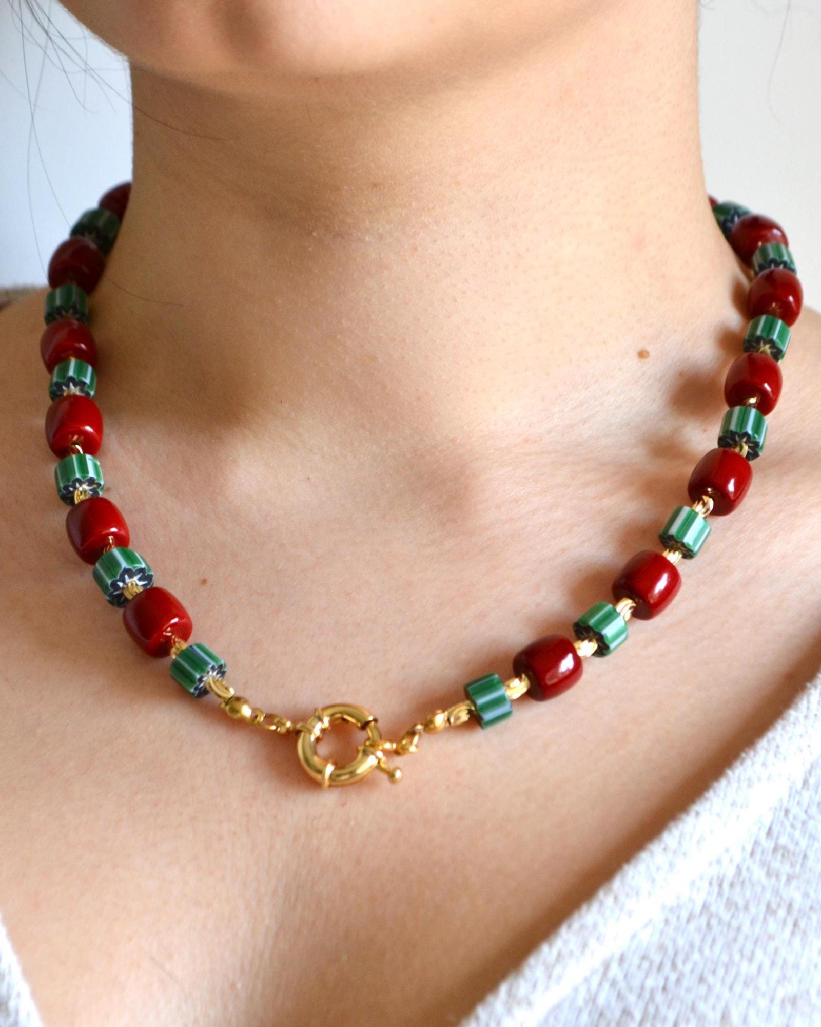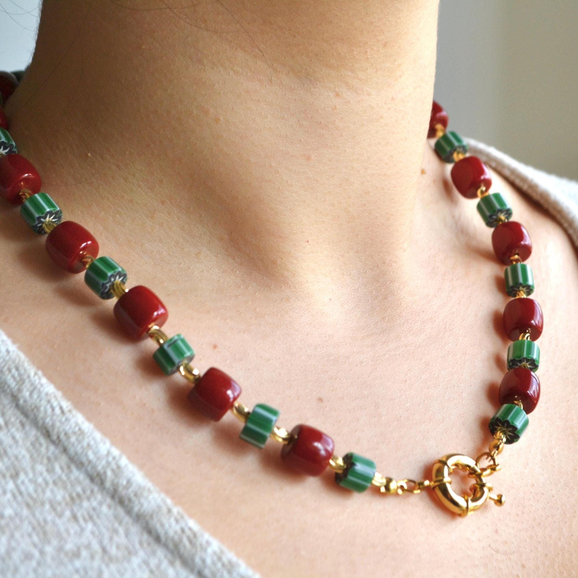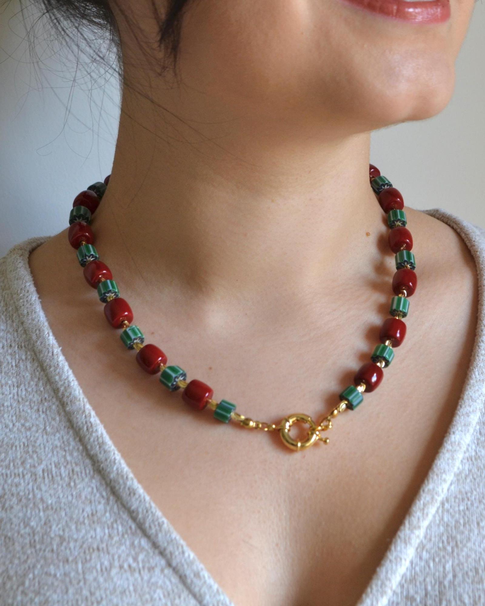 This necklace pairs rich red beads with deep green striped stones and warm gold accents for a striking yet balanced look. The contrast of colors creates a modern statement piece that instantly elevates even the simplest outfit.