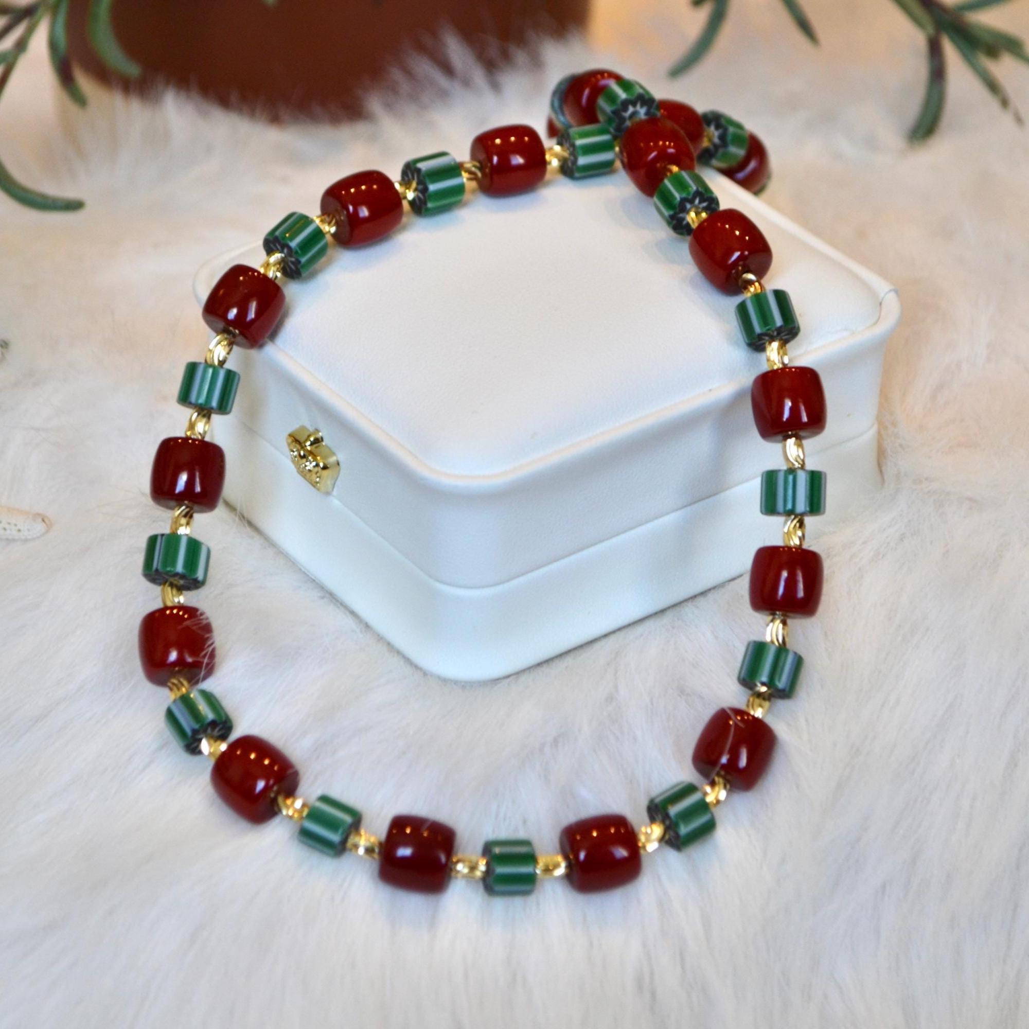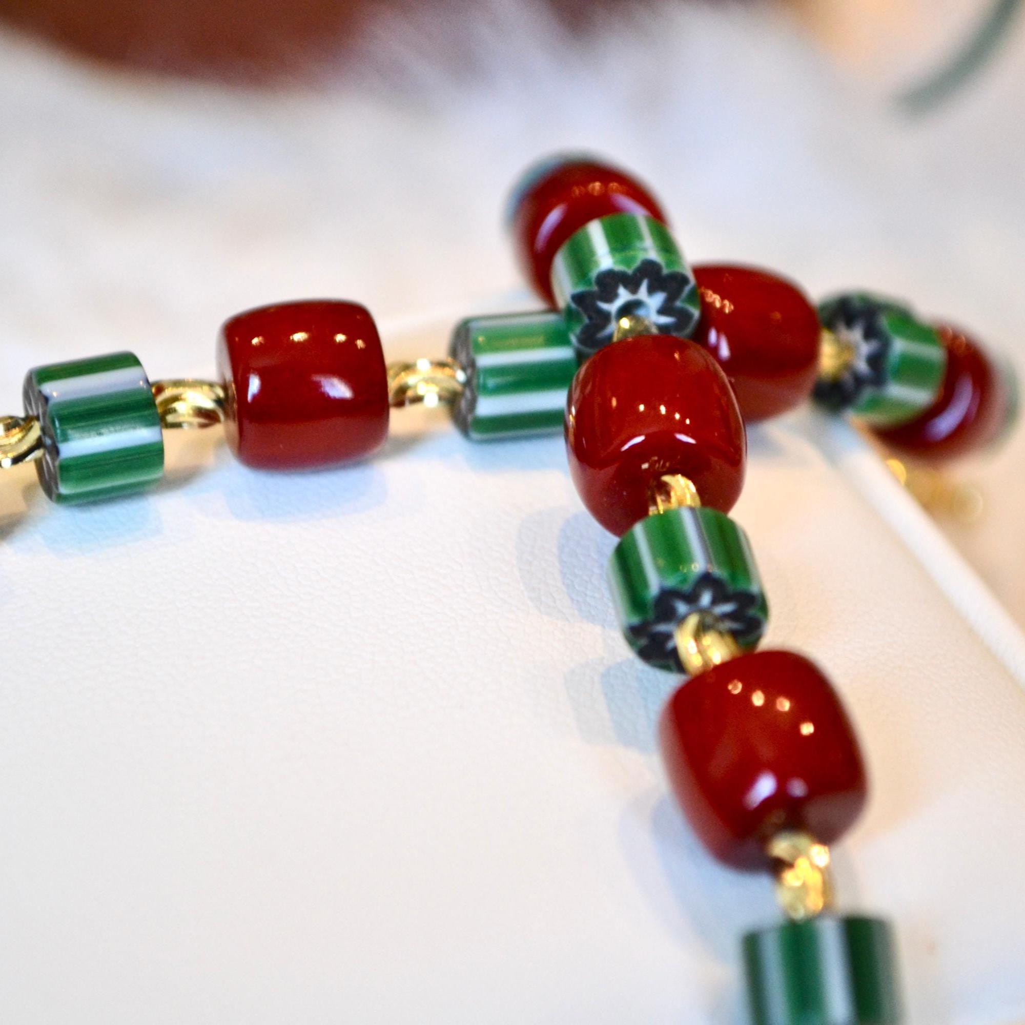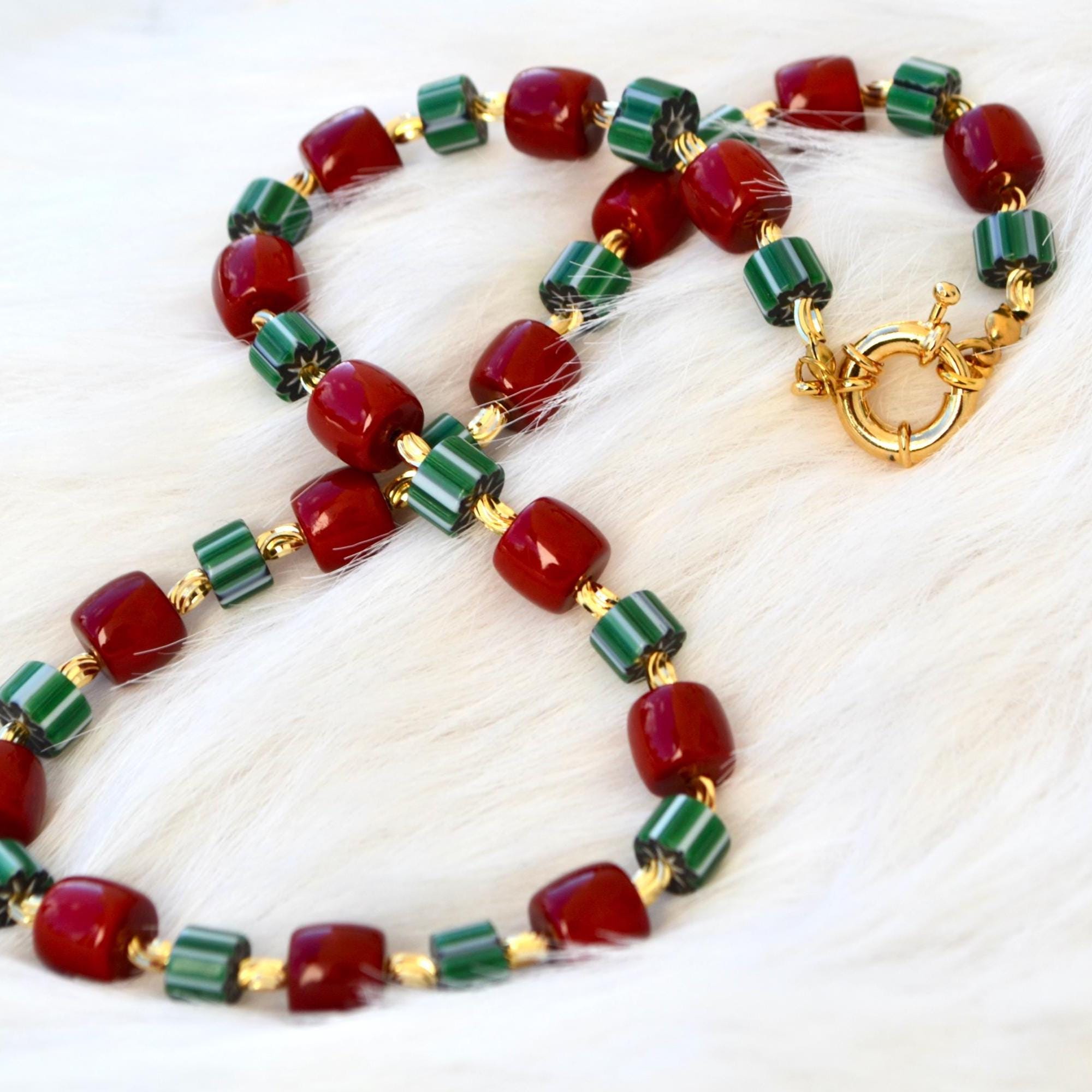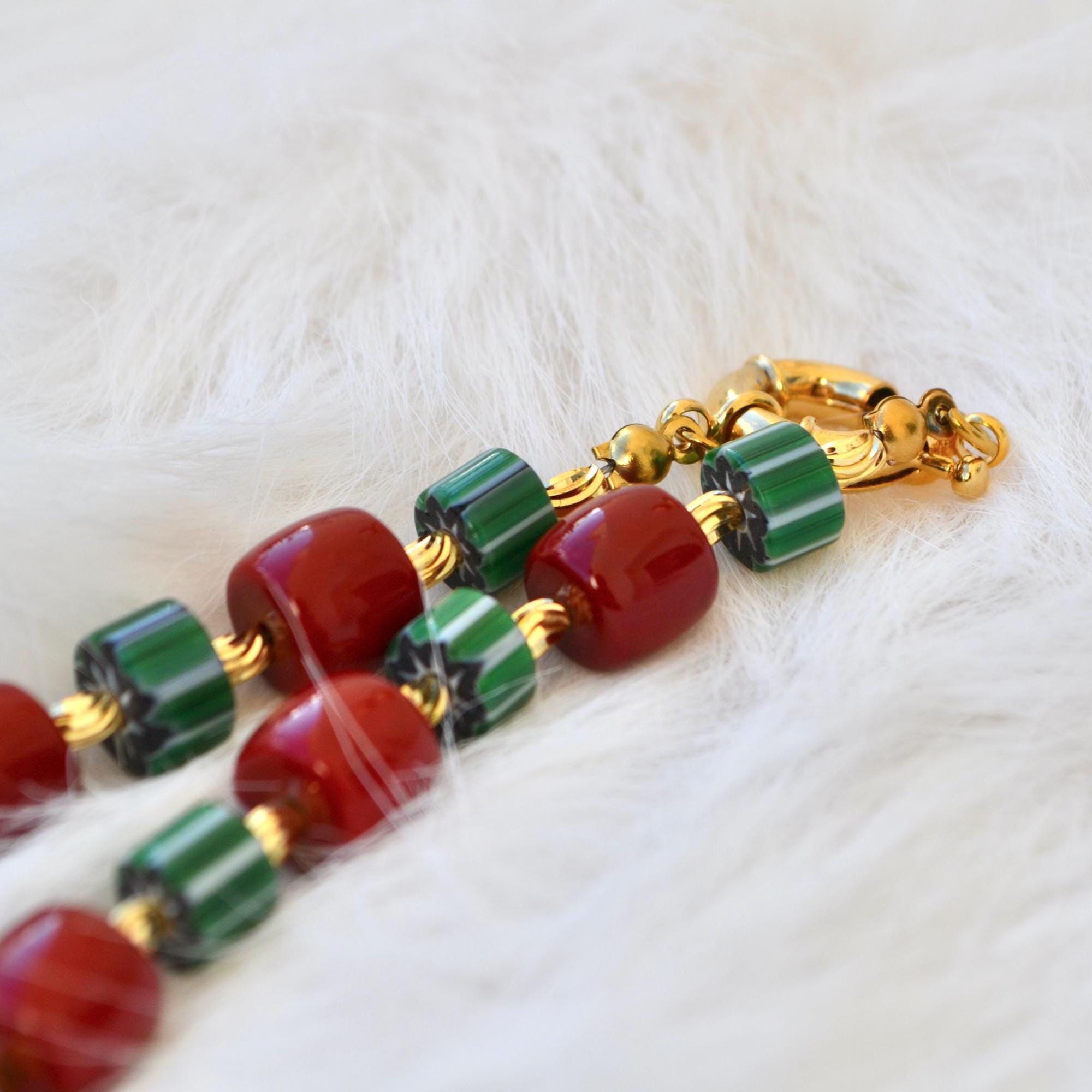 This necklace pairs rich red beads with deep green striped stones and warm gold accents for a striking yet balanced look. The contrast of colors creates a modern statement piece that instantly elevates even the simplest outfit.