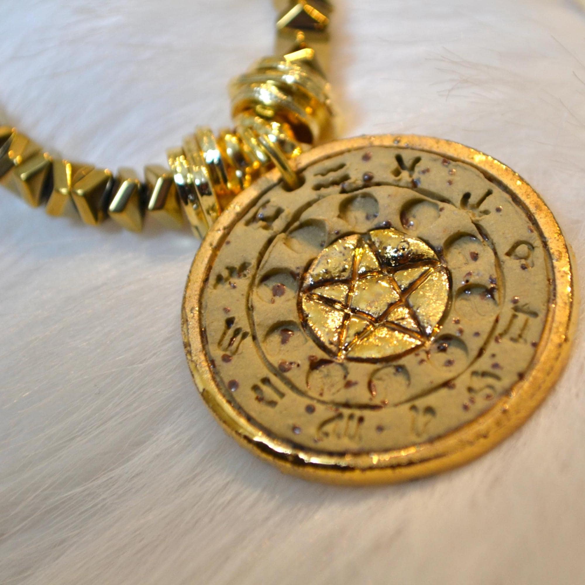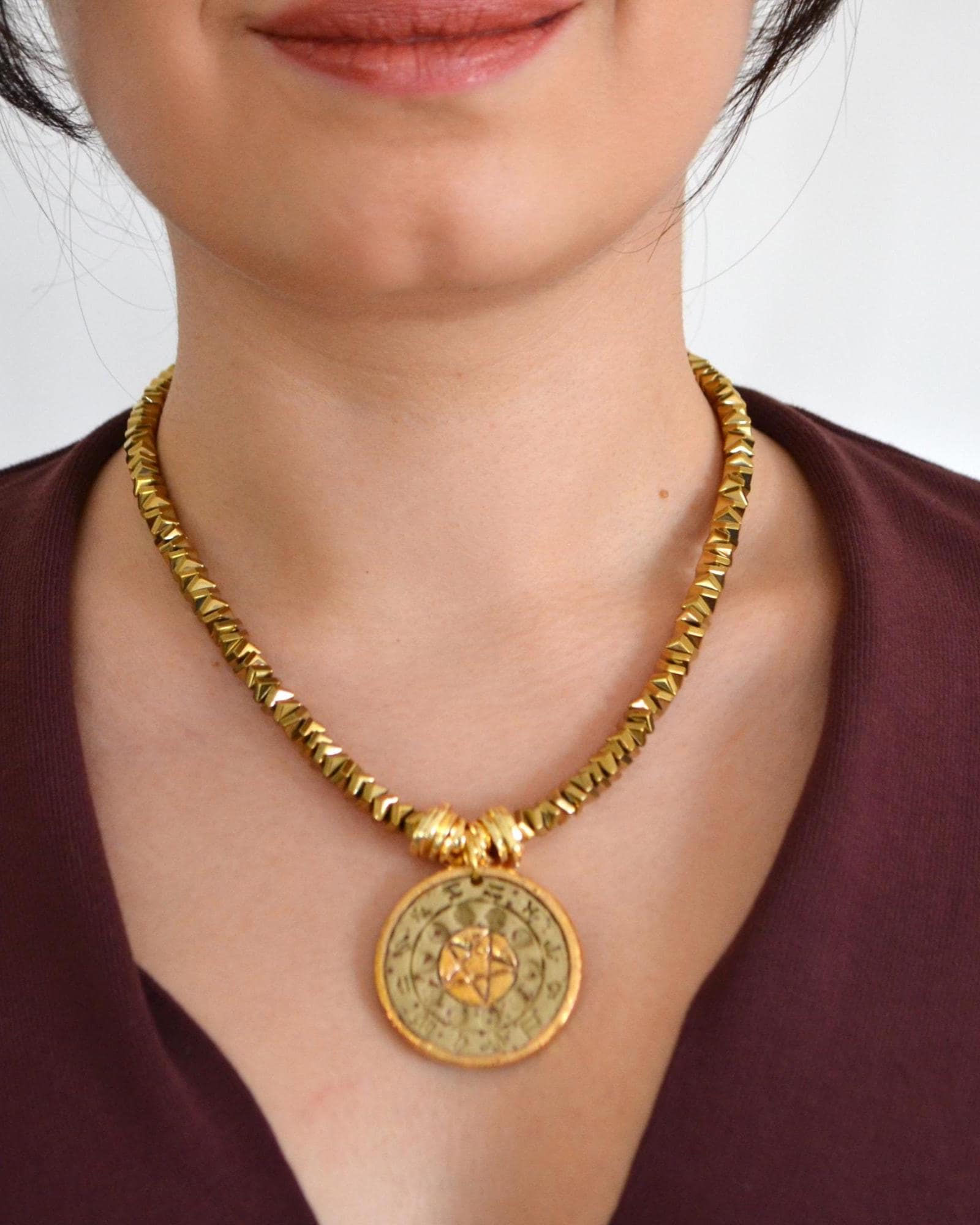 Designed to stand out, this statement pendant necklace adds character and warmth to any look. The sculptural gold beads and detailed medallion create a strong yet elegant piece perfect for layering or wearing alone as a focal jewelry piece.