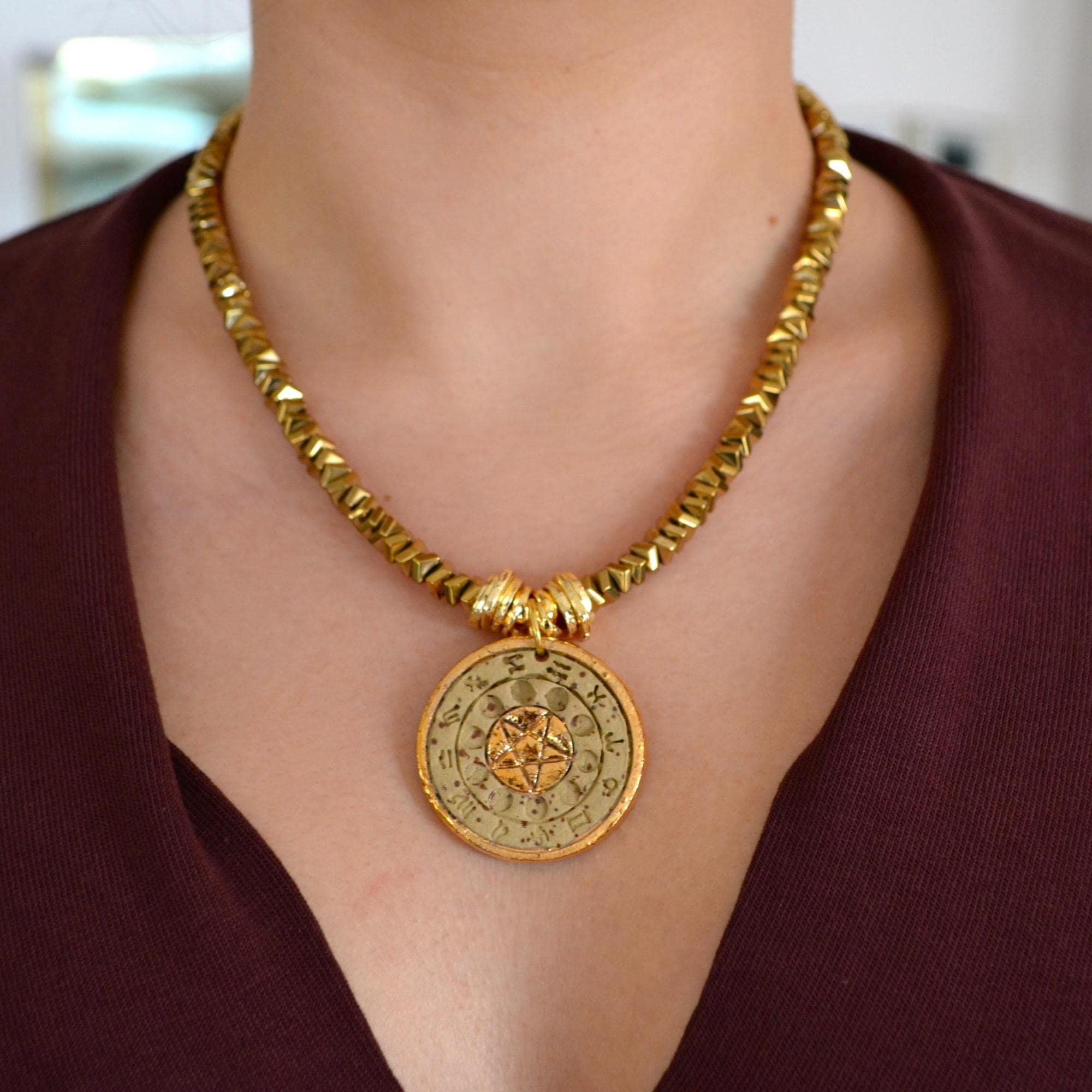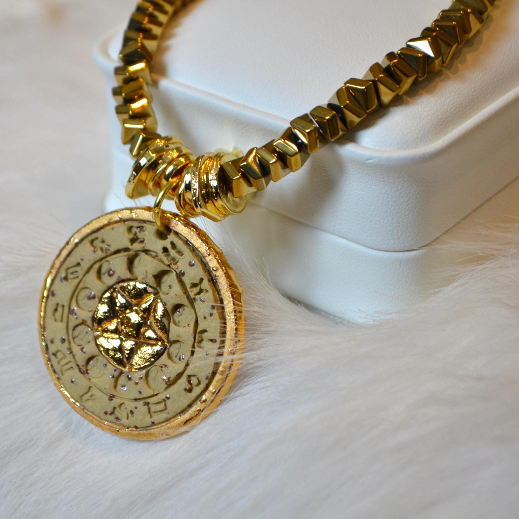 This bold gold coin necklace features a textured medallion pendant on a chunky gold beaded chain, creating a striking statement piece inspired by vintage amulet jewelry. The engraved coin design and rich gold tone give the necklace a timeless look that works beautifully with both elegant and everyday outfits.