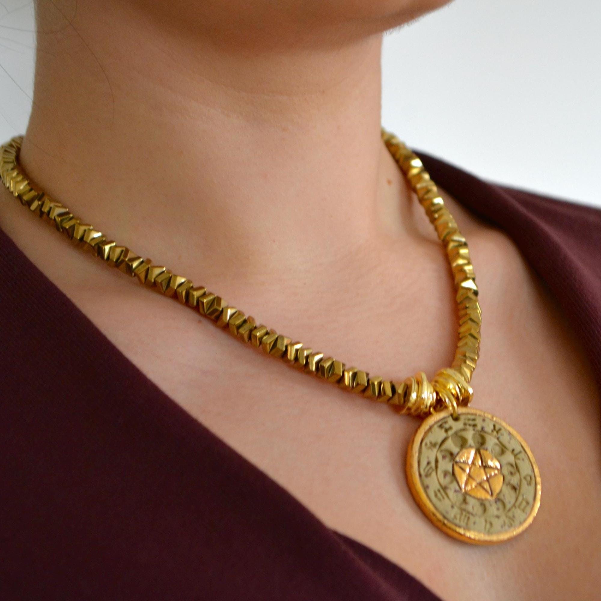 Gold Coin Necklace Statement Pendant, Vintage Amulet Medallion Necklace, Chunky Gold Beaded Boho Jewelry, Gift for Her