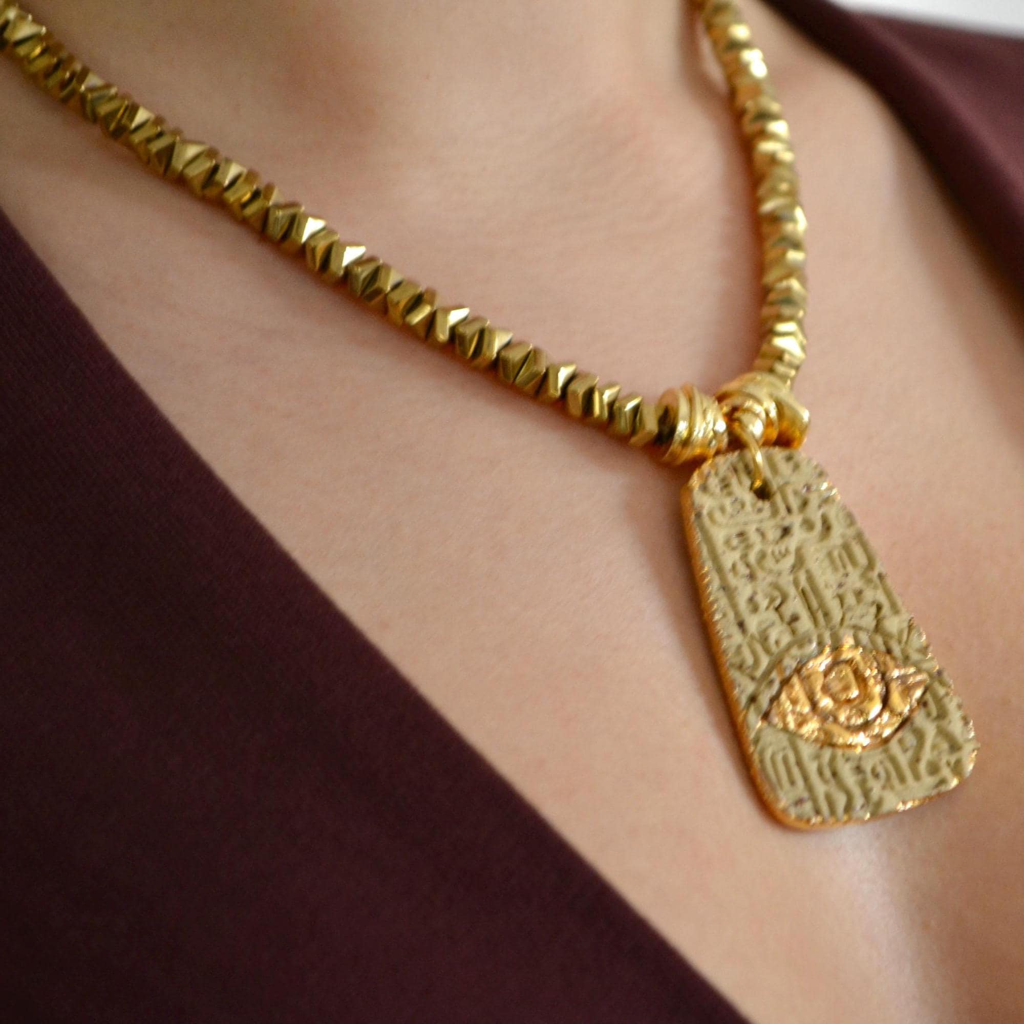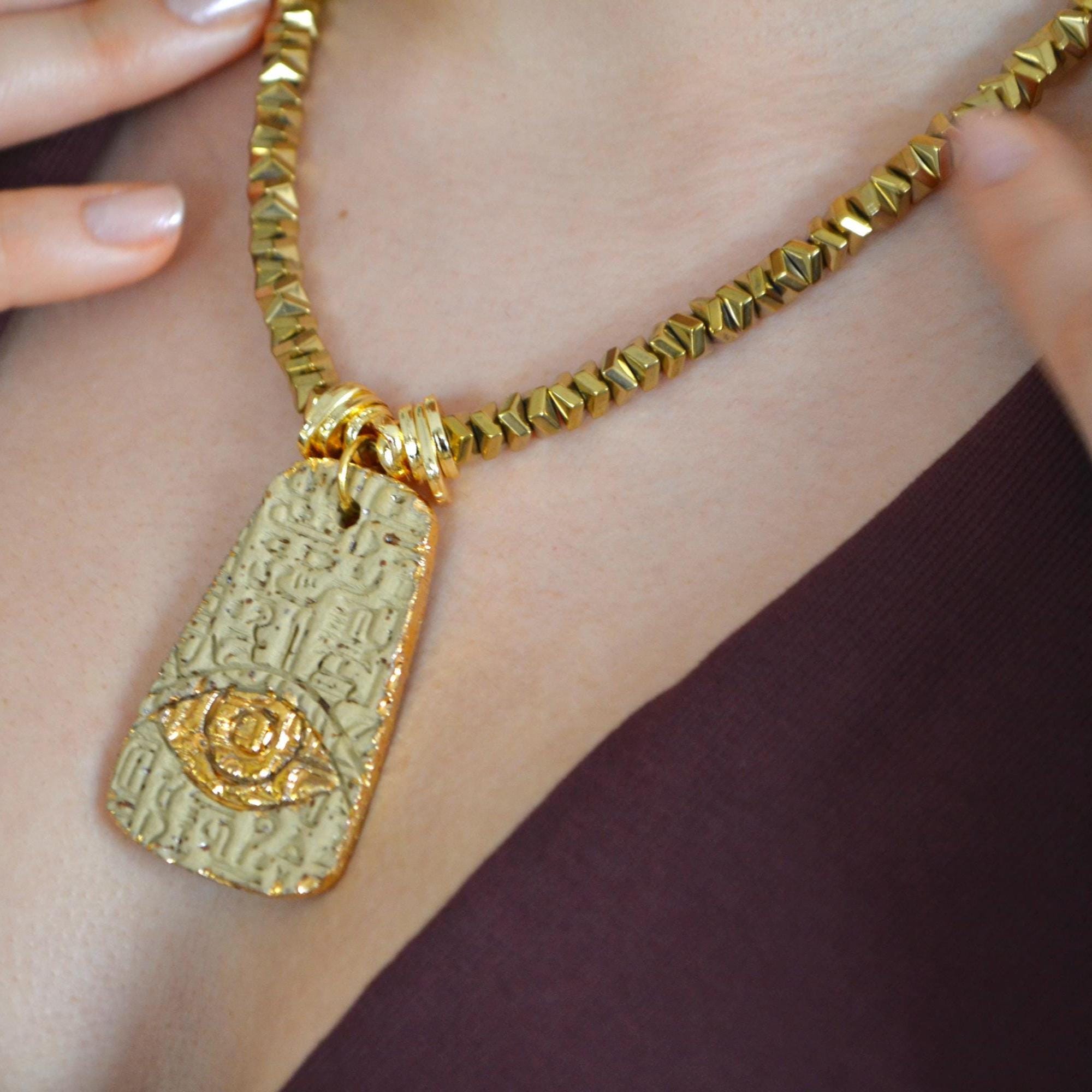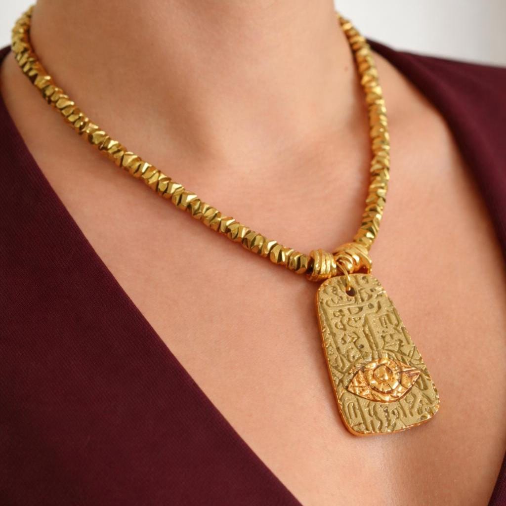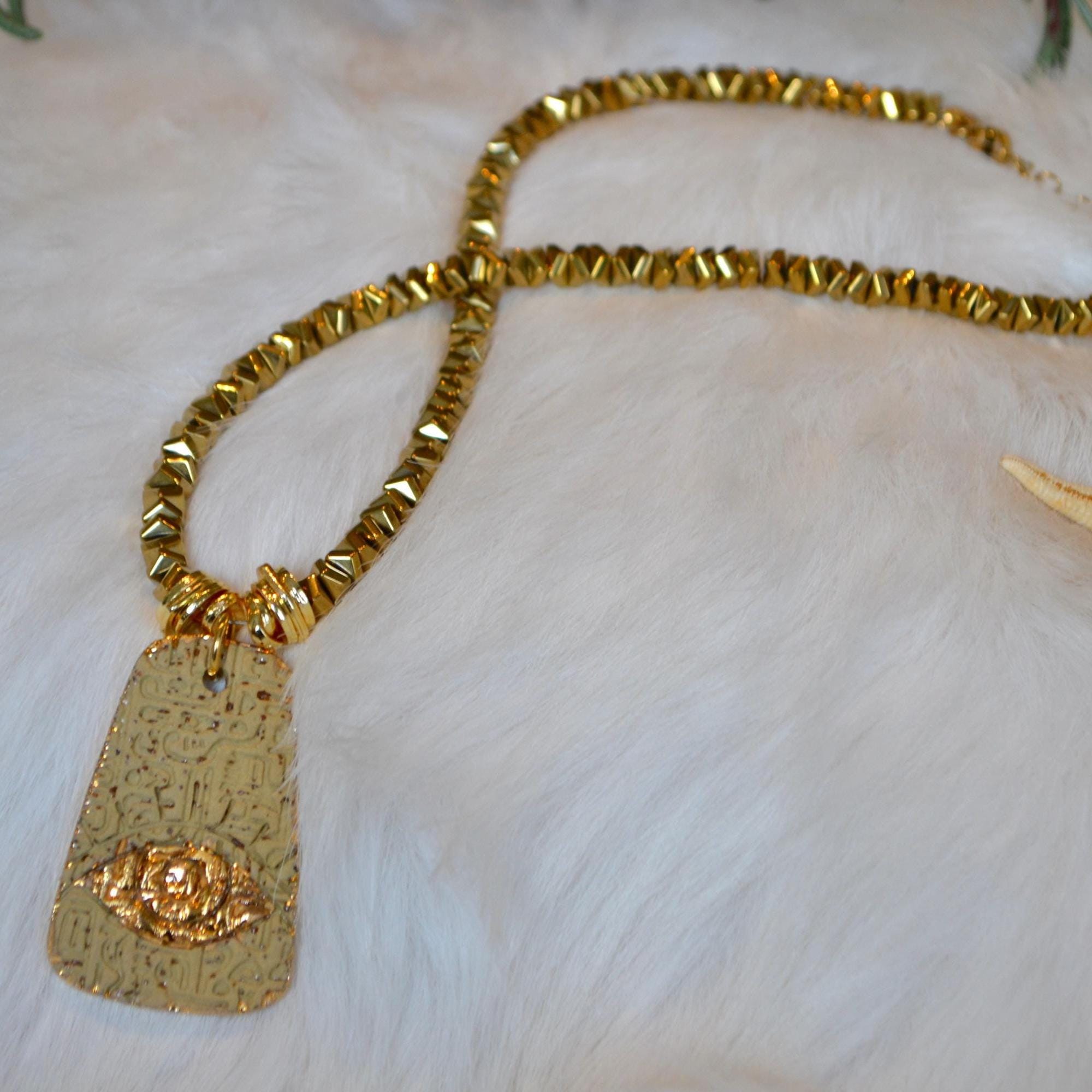 This gold statement necklace features a bold rectangular eye pendant paired with textured gold beads. Inspired by ancient Egyptian symbols and protective amulet jewelry, the design combines a powerful statement look with timeless elegance.