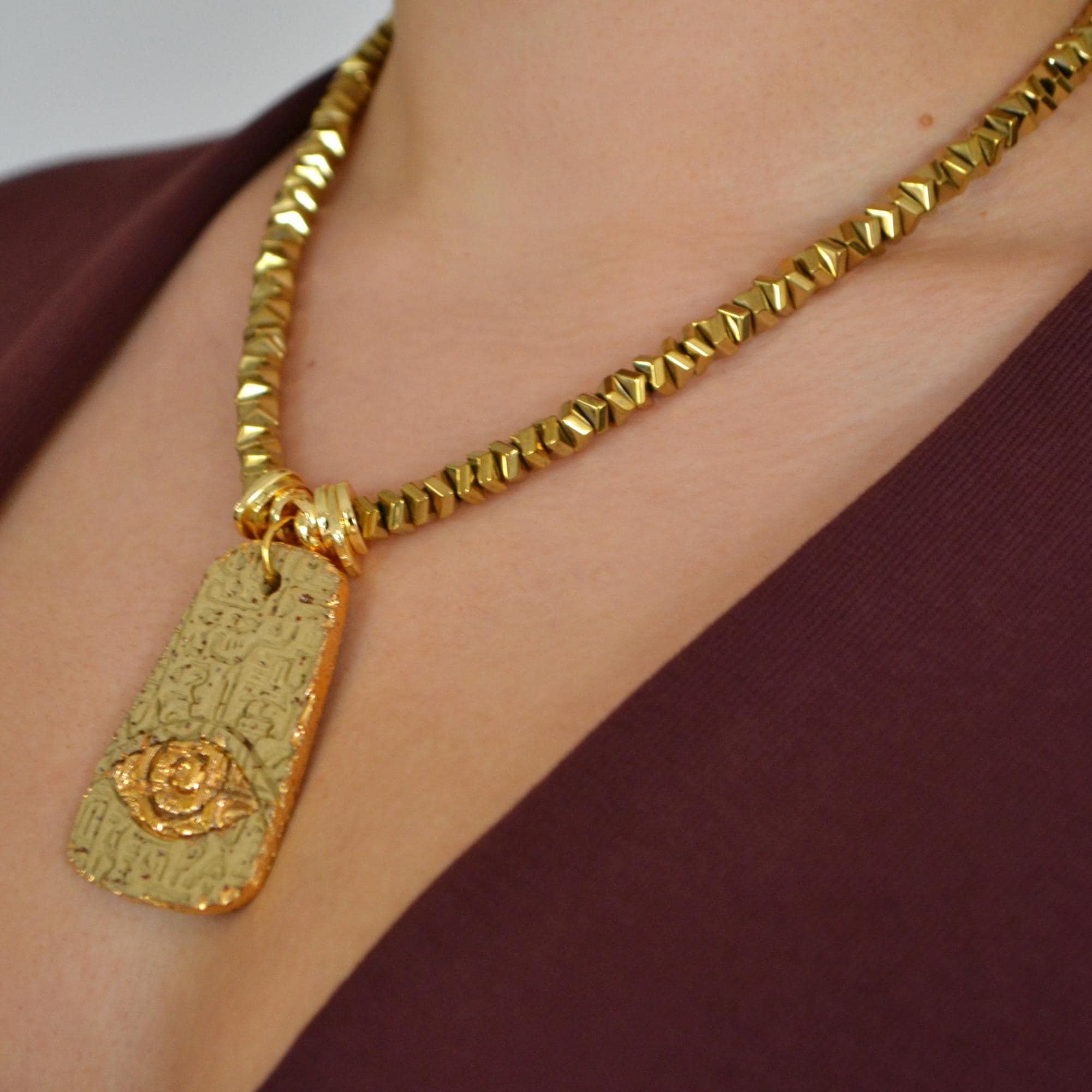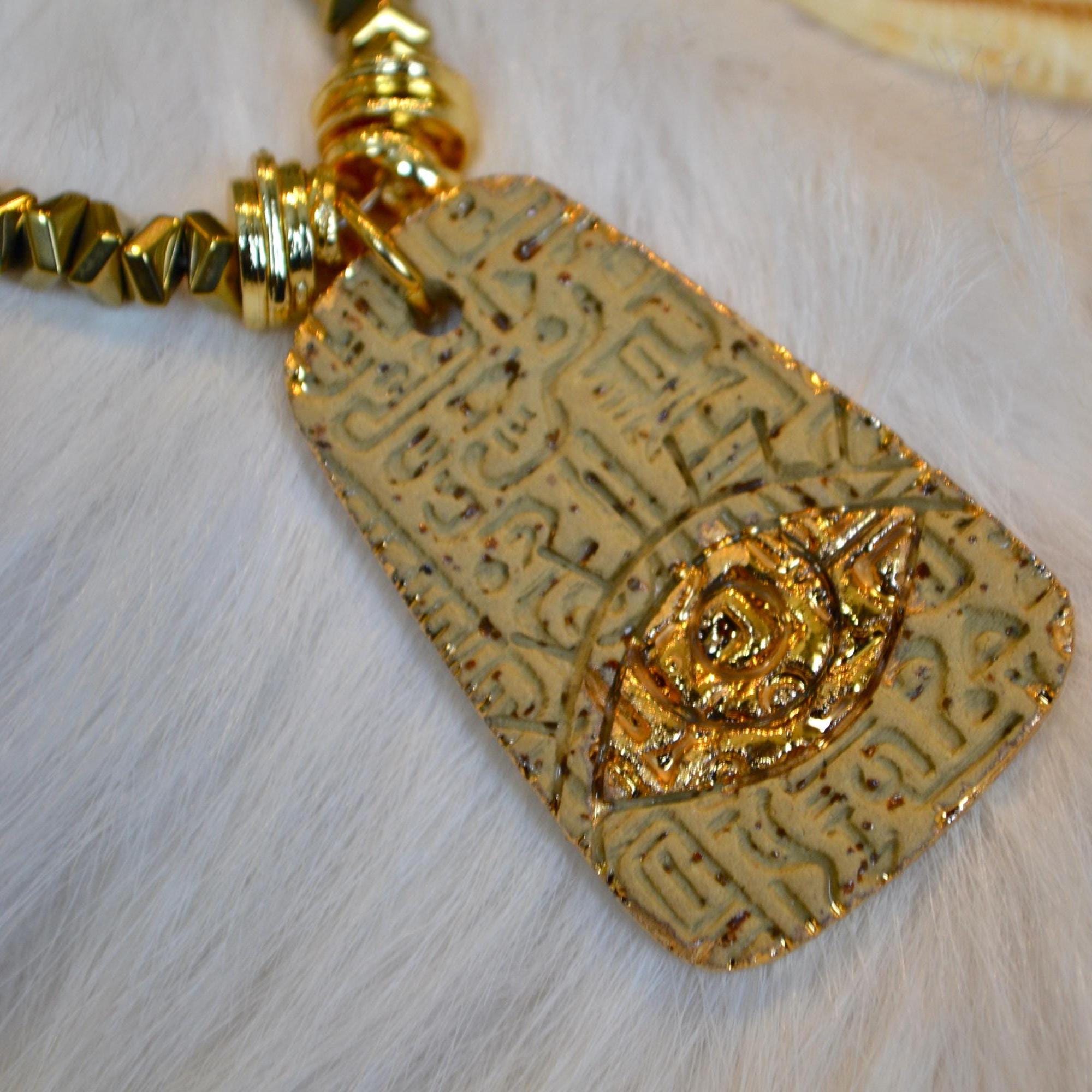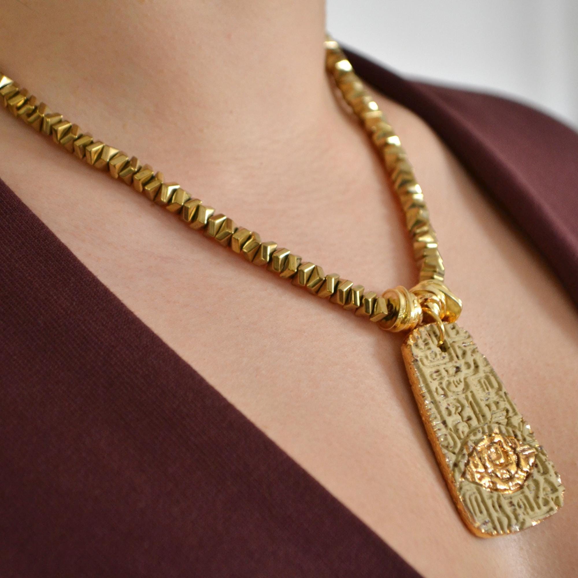 This gold statement necklace features a bold rectangular eye pendant paired with textured gold beads. Inspired by ancient Egyptian symbols and protective amulet jewelry, the design combines a powerful statement look with timeless elegance.