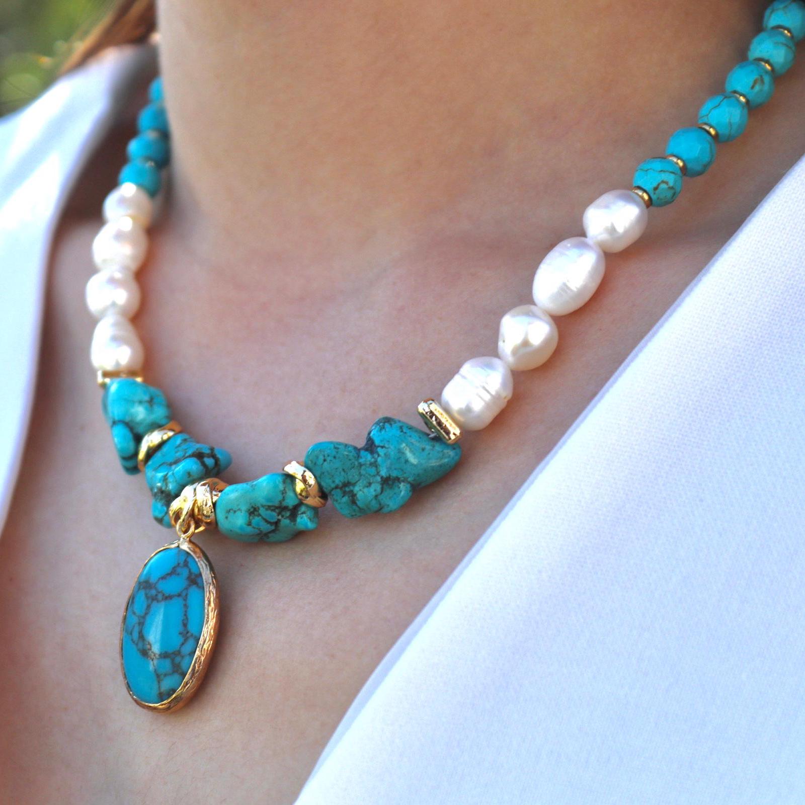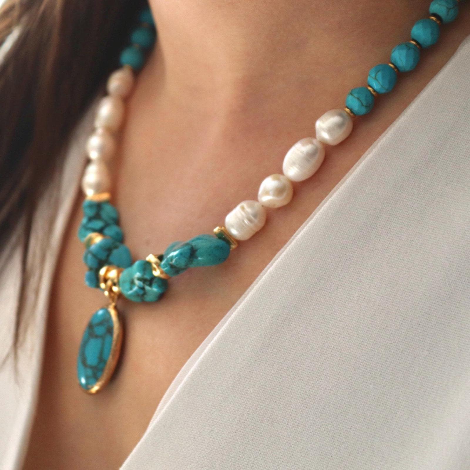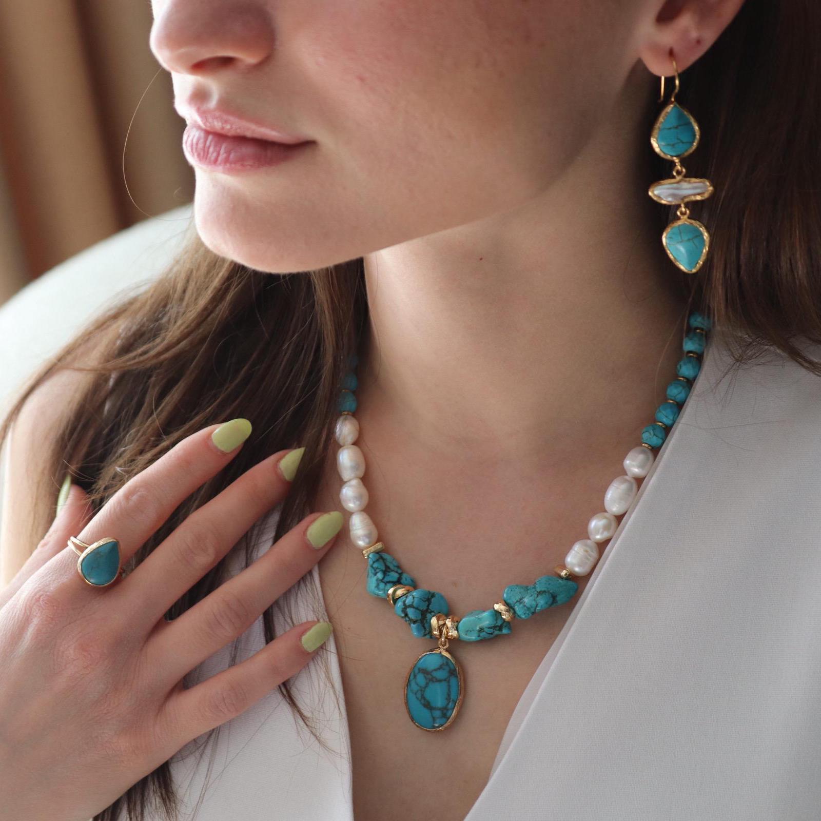 The contrast between natural turquoise and organic pearls creates an elegant statement style inspired by ocean colors and coastal beauty.