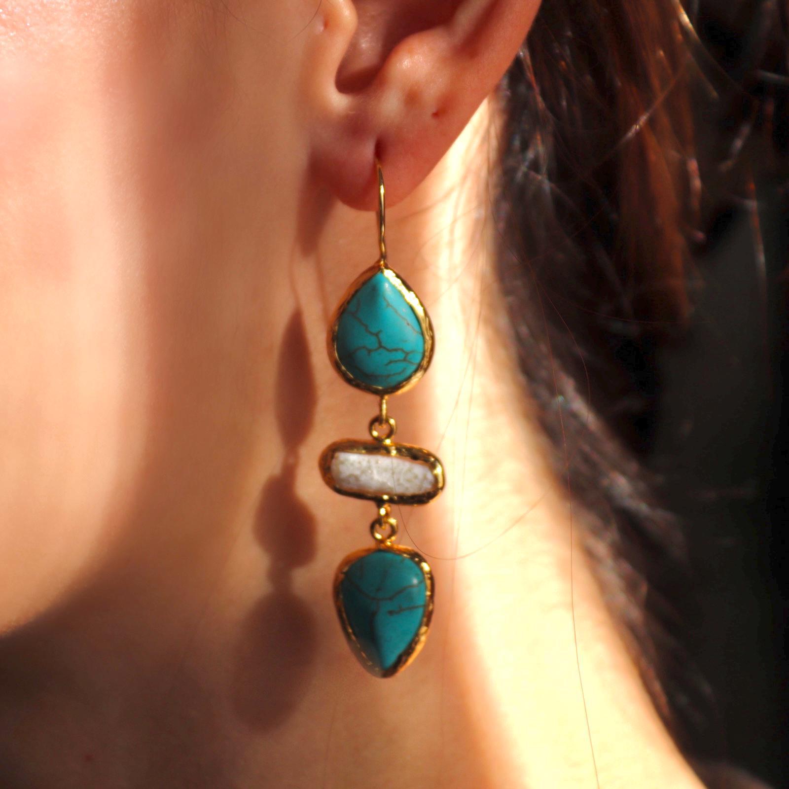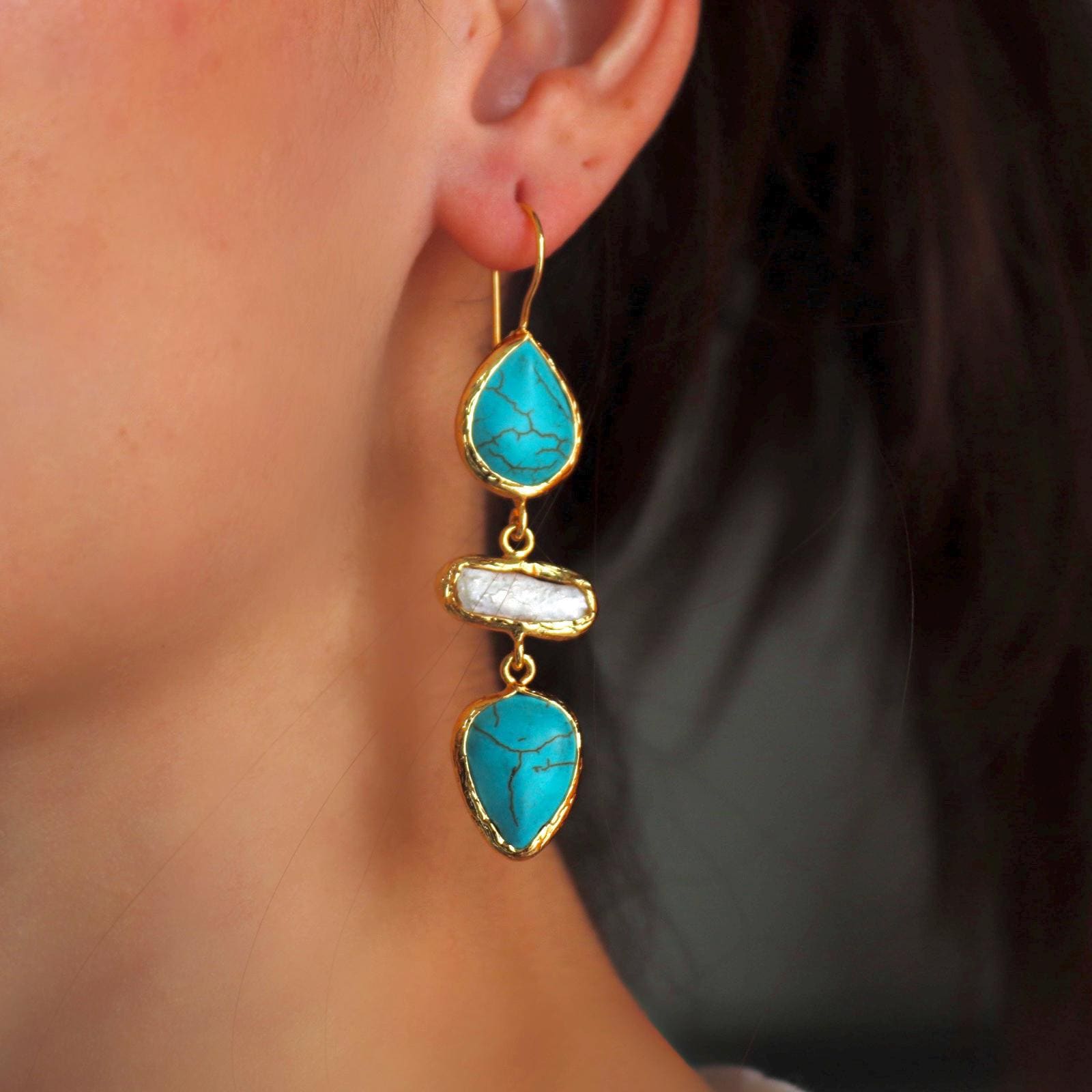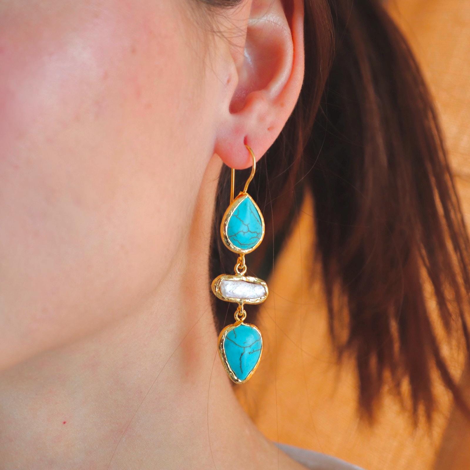 The contrast between natural turquoise and organic pearls creates an elegant statement style inspired by ocean colors and coastal beauty.
